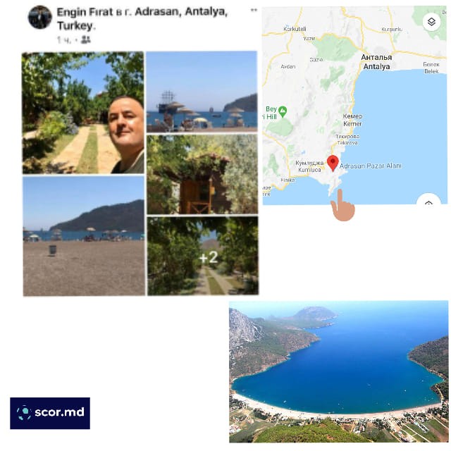 ?В публикации отмечена локация. Это посёлок Адрасан. Он находится в 50 километрах от Кемера и в 100 км от Анталии. ?Посёлок-бухта, или как его всё чаще называют, Чавушкёй, является одним из самых живописных уголков южной Турции.? Говорят, что вода здесь настолько прозрачна, что дно можно рассмотреть на глубине 20 метров.? По некоторым данным, Энгин Фират проживает в регионе курорта Анталия.