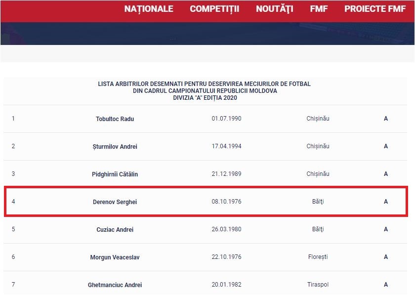 Что происходит спустя 5 лет? Если открыть официальный сайт молдавской федерации футбола, то среди судей чемпионата Дивизии А-2020 можно найти … Сергея Деренова. Как такое может быть, спросите вы? Хороший вопрос. Сразу отметим, не идёт речь о какой-либо критике в чей-либо адрес. Вовсе нет. Просто хочется прозрачности и понимания. По сути, человека забыли, а тут бабах, и он всплывает среди остальных судей Дивизии А.