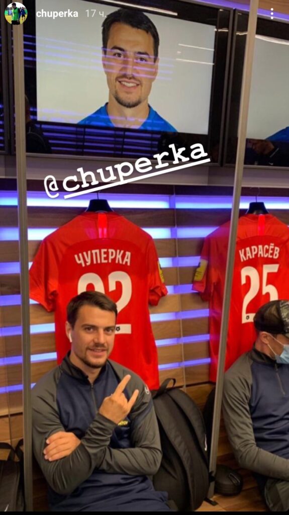 Валерий Чуперка, который недавно забил за «Тамбов» в РПЛ, кайфует. Он – в тройном экземпляре: он (настоящий), его изображение на мониторе и футболка с его фамилией.