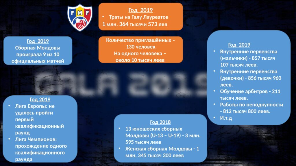 Например, за весь позапрошлый – 2018 год, на нужды женской сборной Молдовы по футболу было потрачено ровно столько, сколько за один вечер на Гале Лауреатов ‘19 года: 1 млн. 345 тысяч 300 леев.
