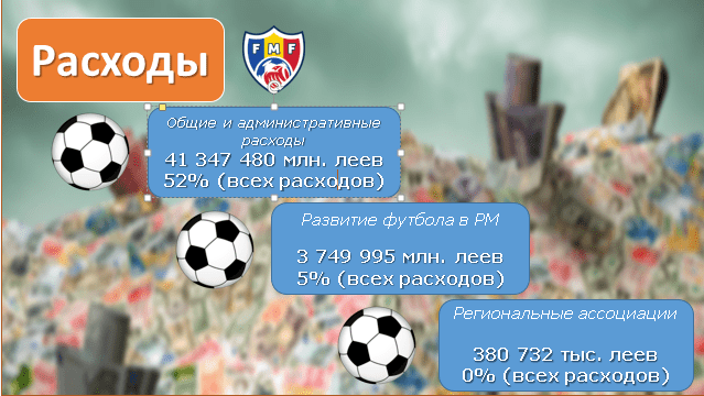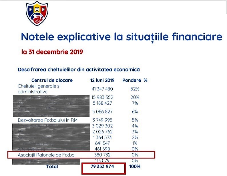 На развитие футбола расходы составили только 5%. Доля расходов на ВСЕ региональные ассоциации – 0% (да, ноль). Или всего 380 732 тысяч леев (в год).