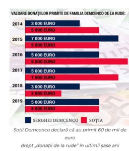 Începând cu 2014, Sergiu Demcenco a declarat donații de la rude în valoare de 60 de mii de euro.